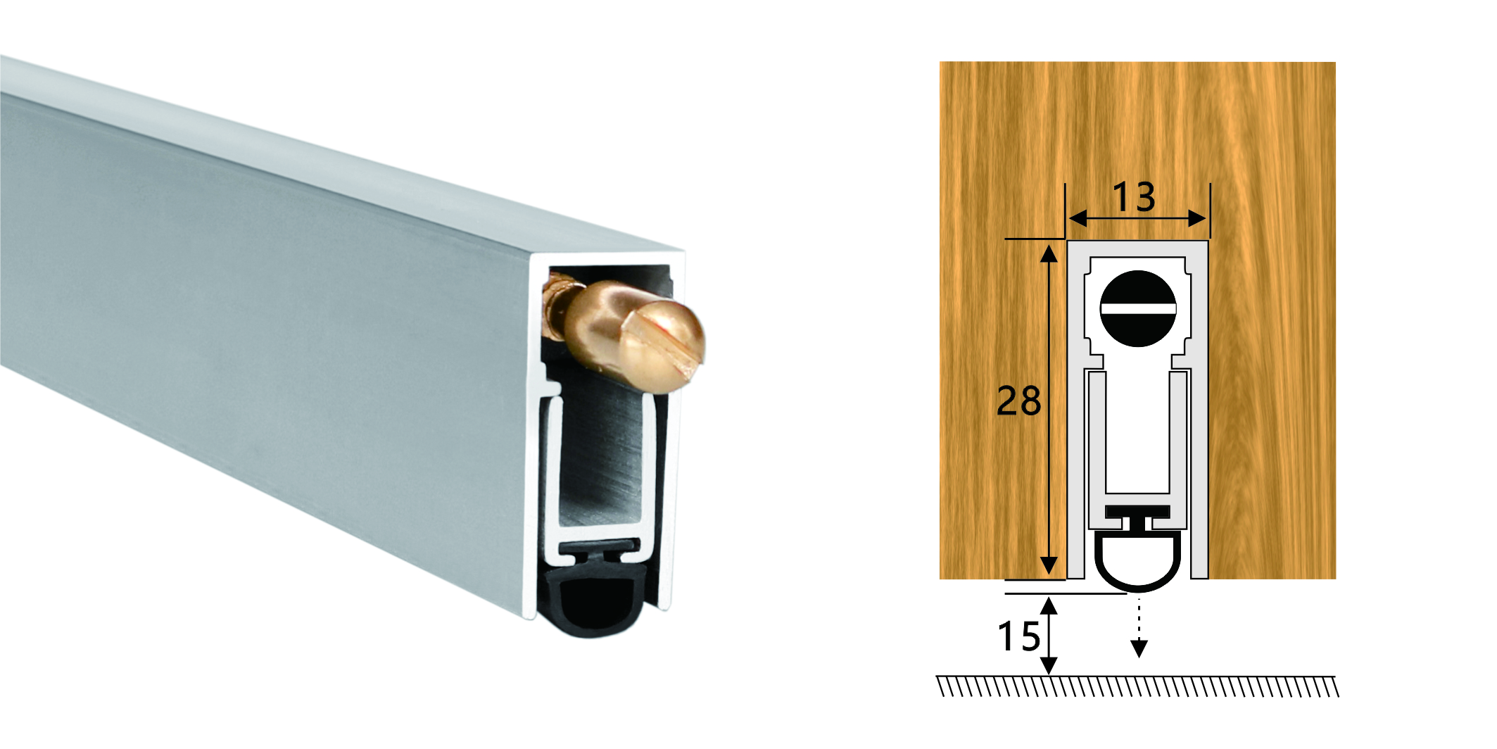 嵌入式門底自動升降式密封器,四連桿機(jī)構(gòu),適用于門扇內(nèi)開槽的門。安裝時需在門底有一個28mm*13mm的通槽,將產(chǎn)品放置其中,將兩端蓋板和密封器用螺絲固定(或用螺絲從密封條底部向上固定),使用本產(chǎn)品不影響門的整體風(fēng)格。
